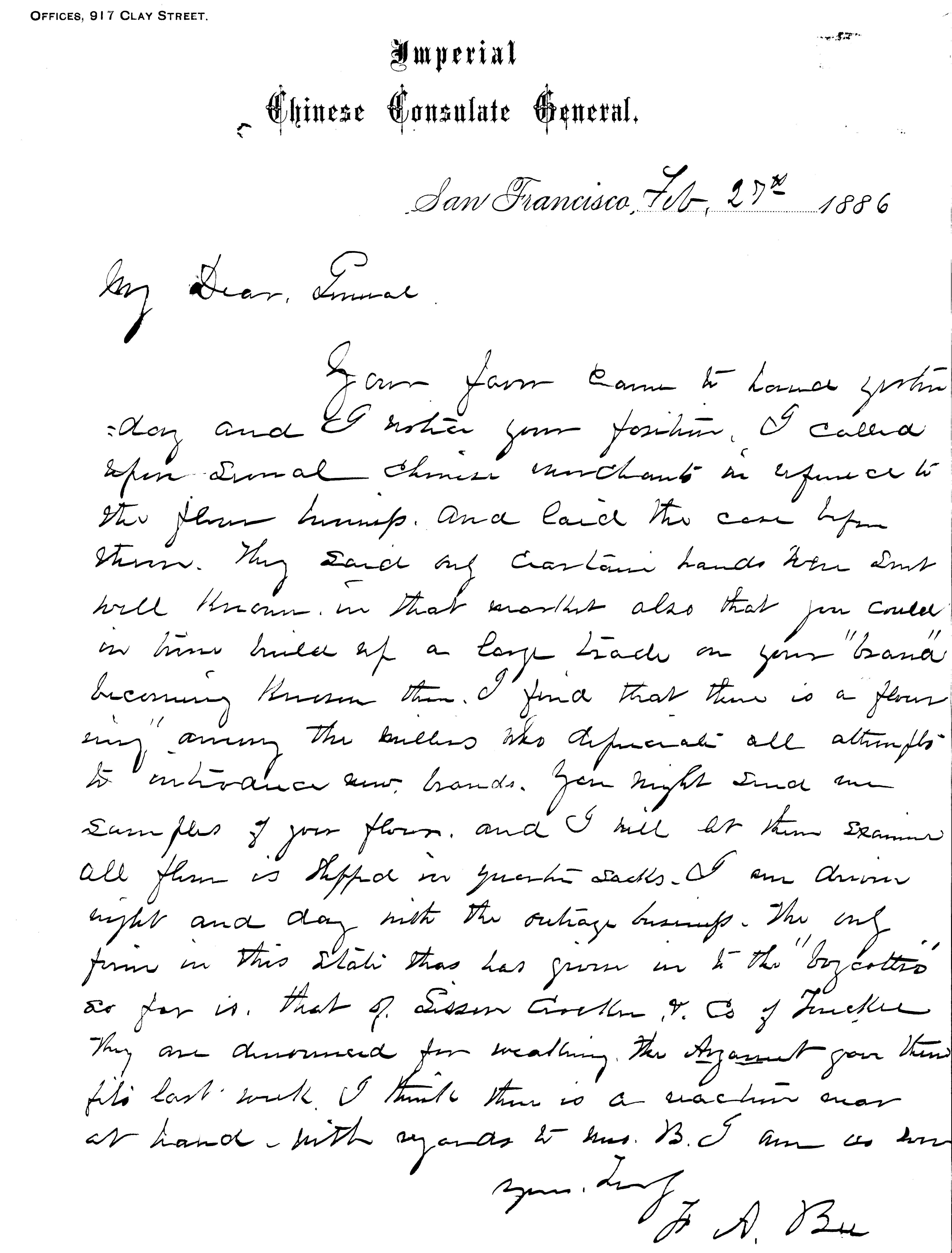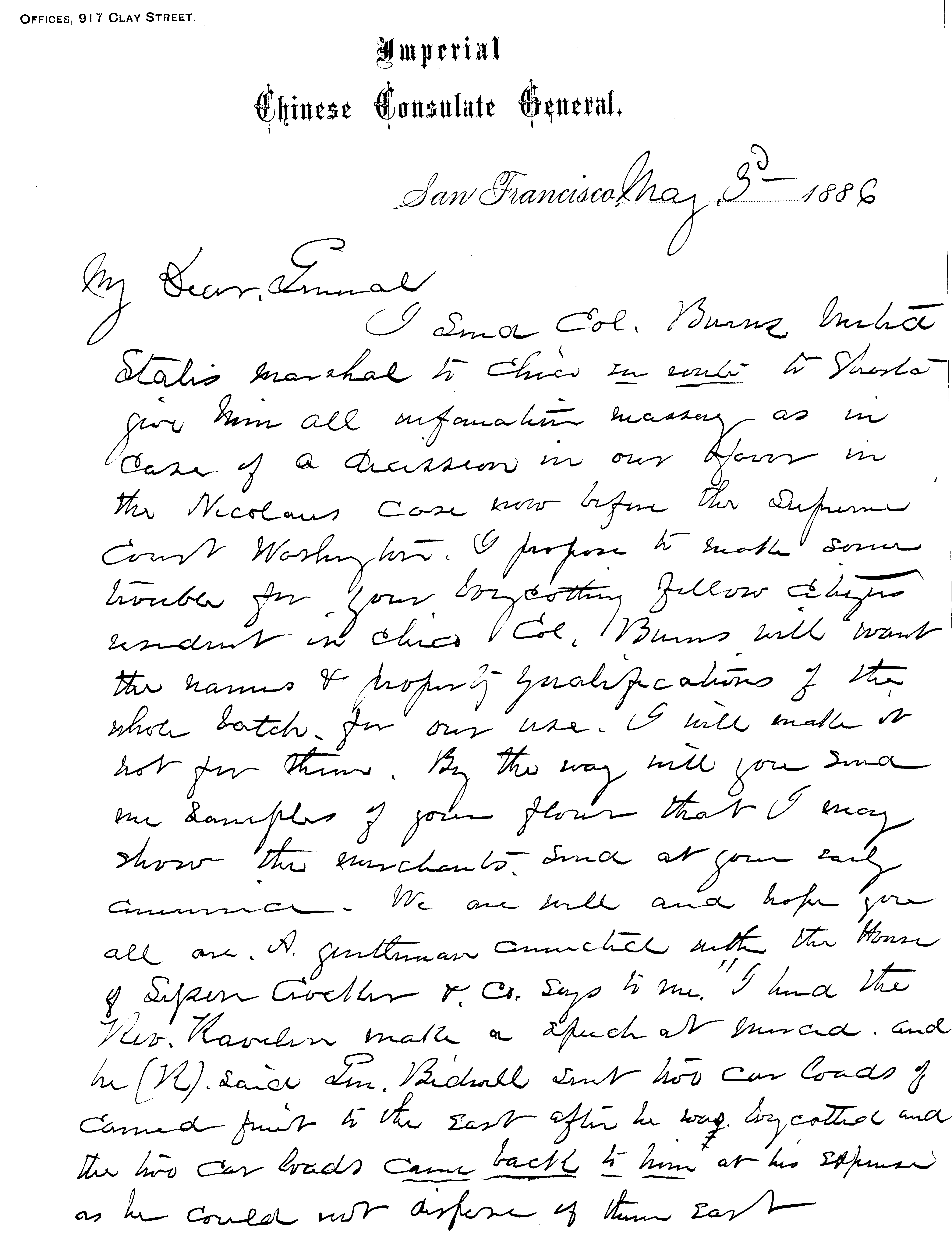 Letter of May 3, 1886 requested General Bidwell to cooperate with Colonel Burns to obtain names of anti-Chinese boycott leaders. "I propose to make some trouble for your boycotting citizens resident in Chico. Colonel Burns will want the names and property qualifications of the whole batch for our use. I will make it hot for them."