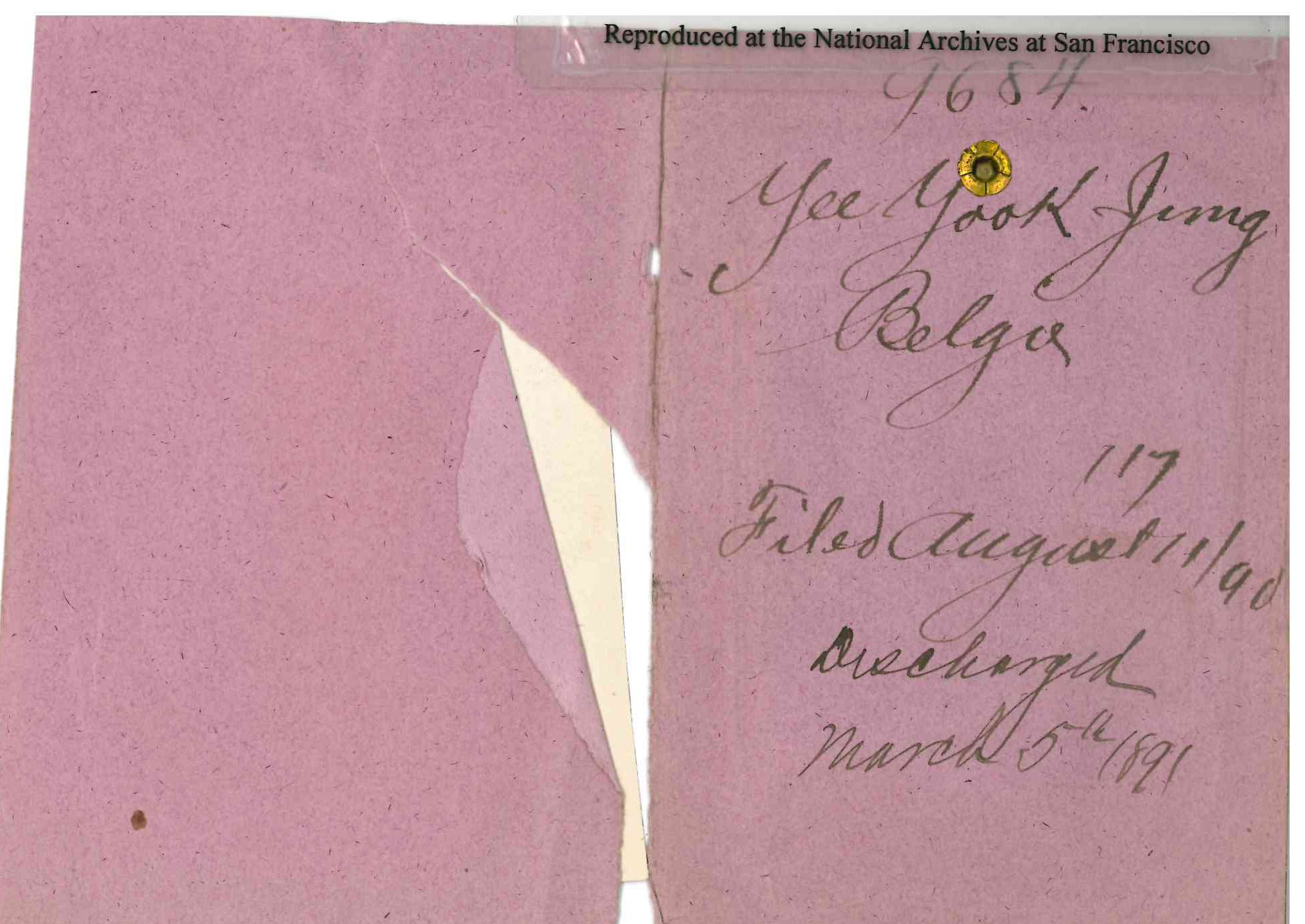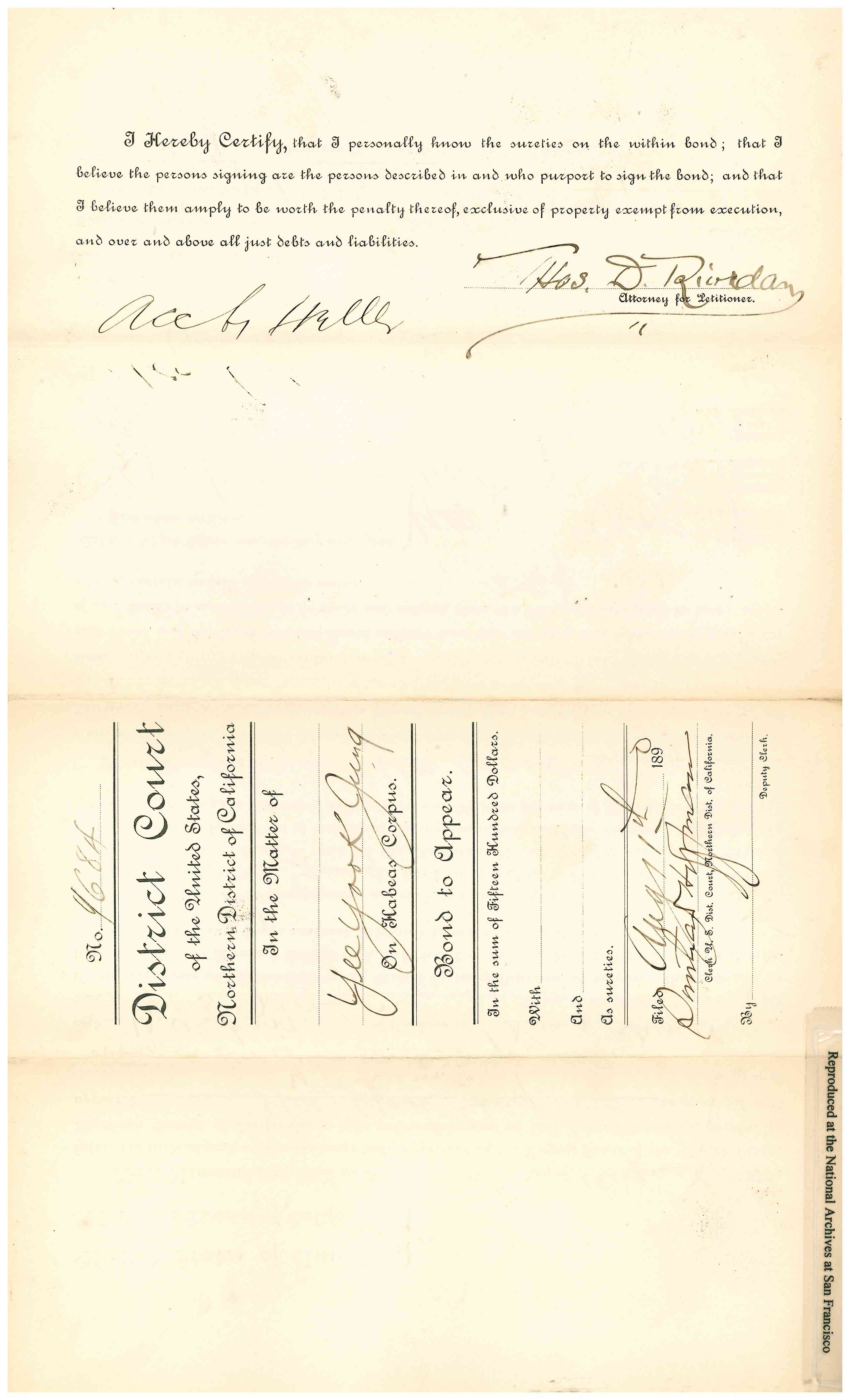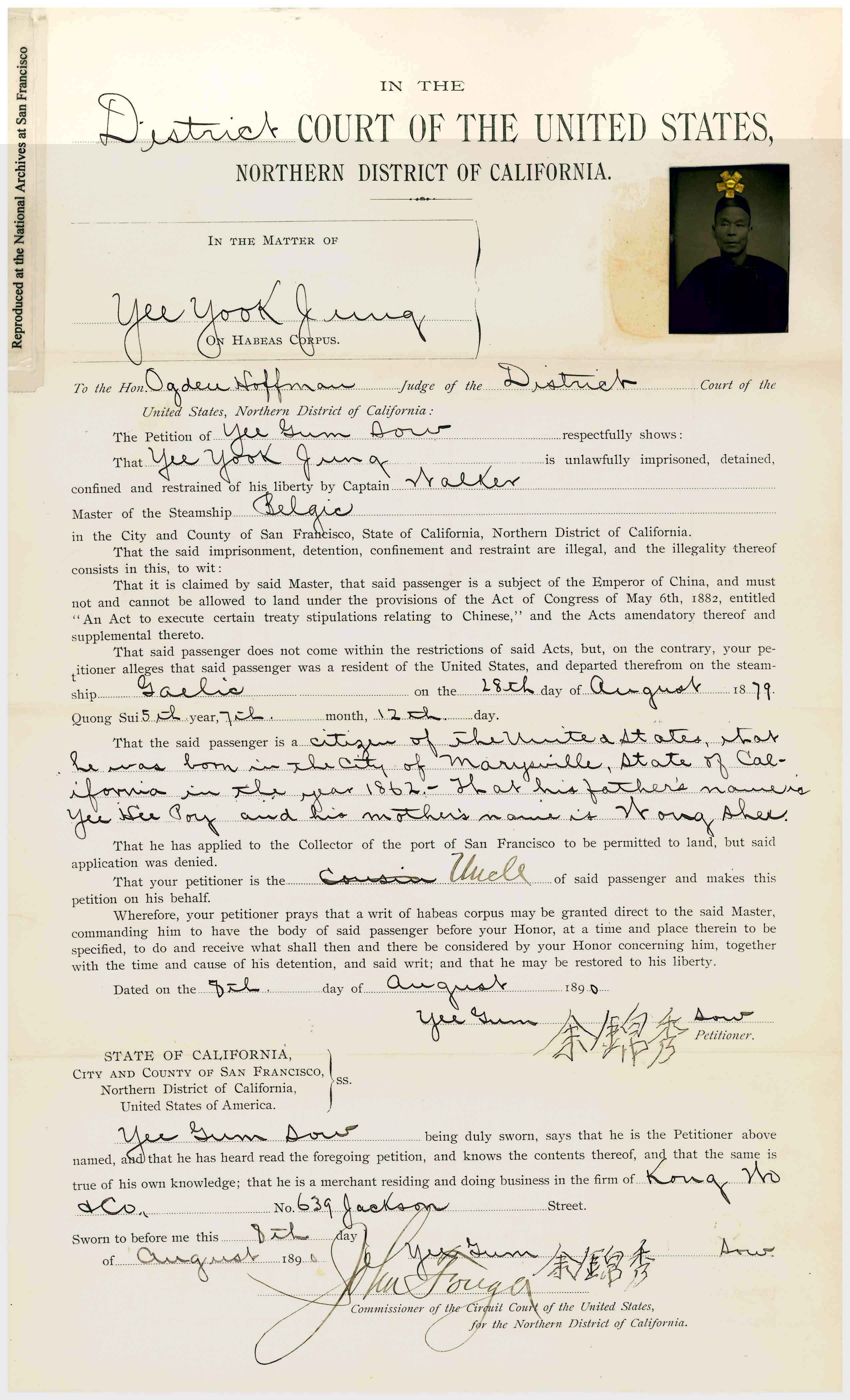 Gaelic. He returned on the steamship Belgic, and arrived in San Francisco on July 31, 1890. The Collector of the Port of San Francisco refused permission for his landing. Yee Gum Sow petitioned for a Writ of Habeas Corpus on August 8, 1890. A bond was posted. S. C. Houghton, Commissoner recommended Discharge on March 5, 1891. Detainee was represented by Thomas