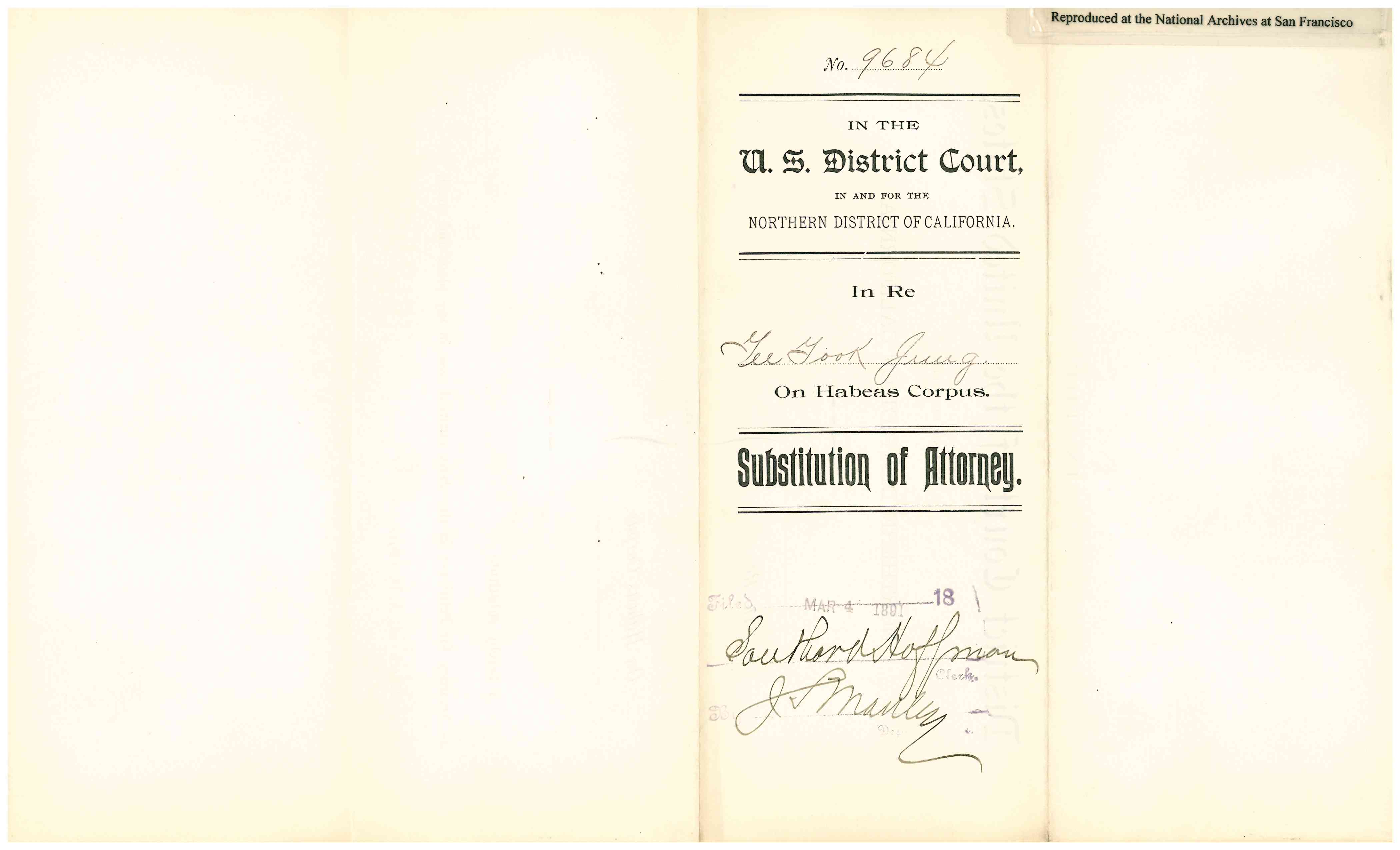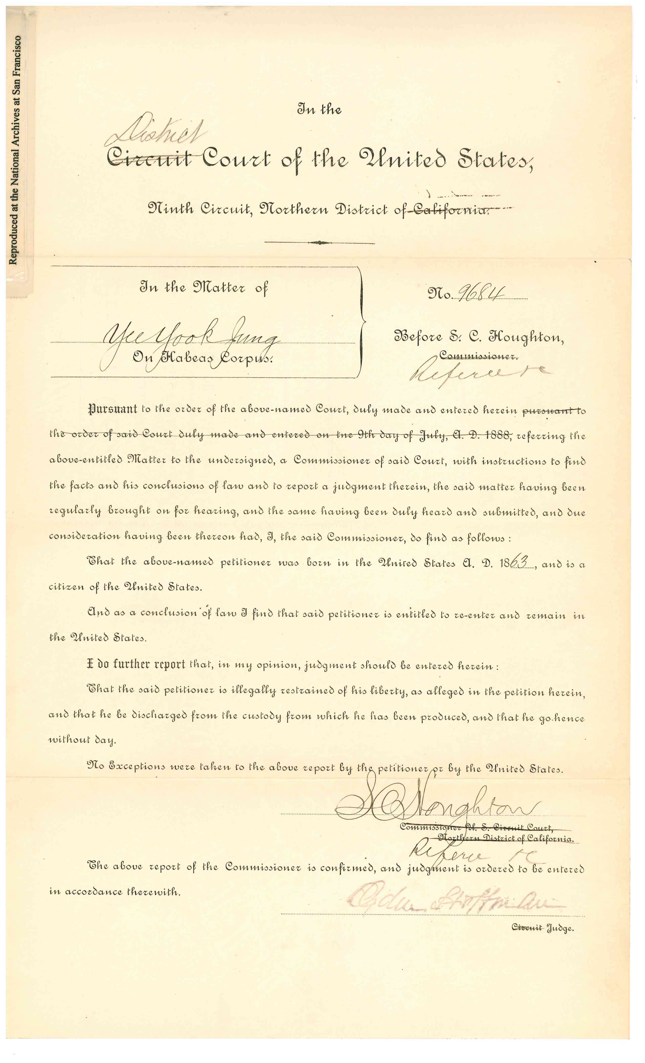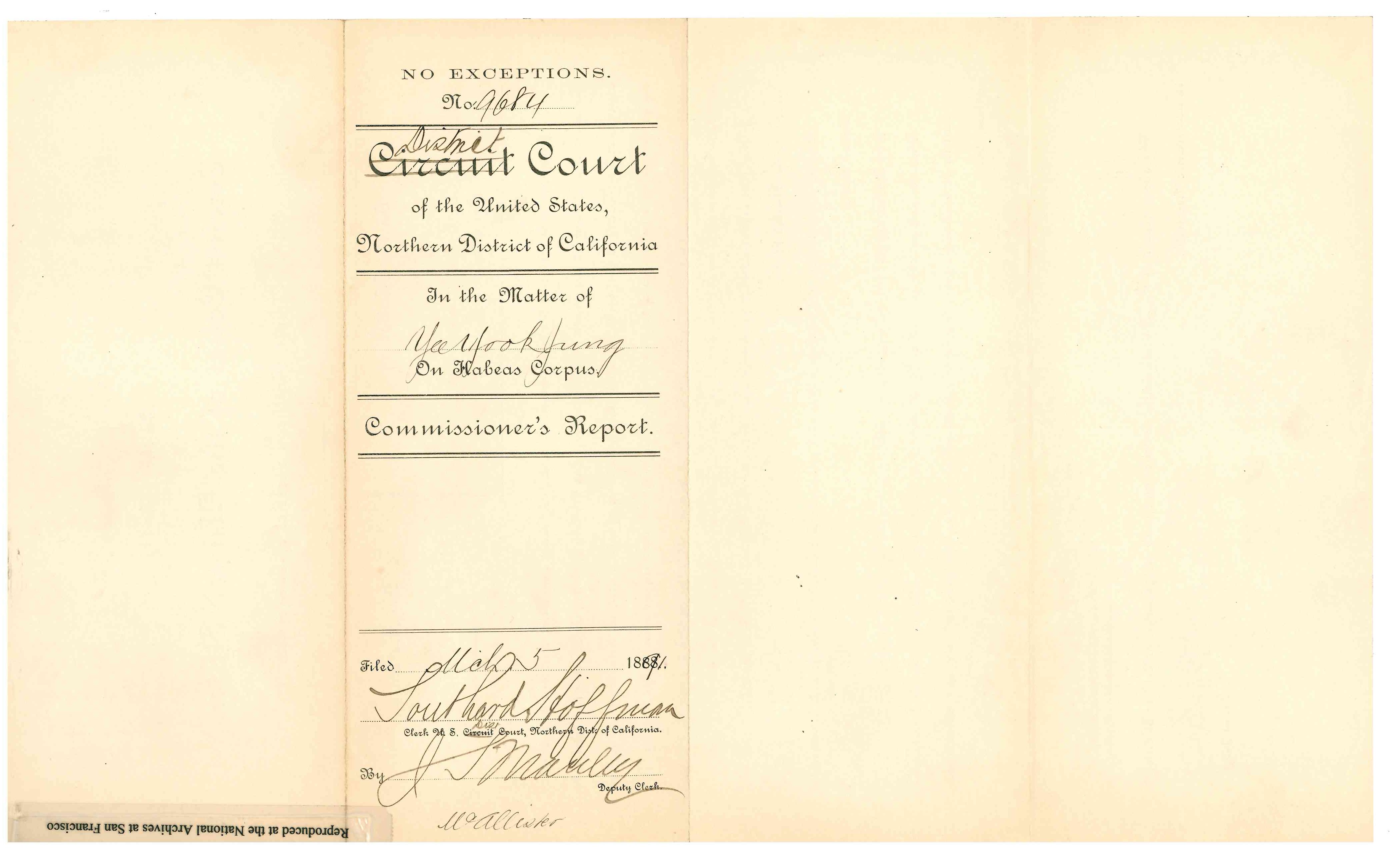 Gaelic. He returned on the steamship Belgic, and arrived in San Francisco on July 31, 1890. The Collector of the Port of San Francisco refused permission for his landing. Yee Gum Sow petitioned for a Writ of Habeas Corpus on August 8, 1890. A bond was posted. S. C. Houghton, Commissoner recommended Discharge on March 5, 1891. Detainee was represented by Thomas