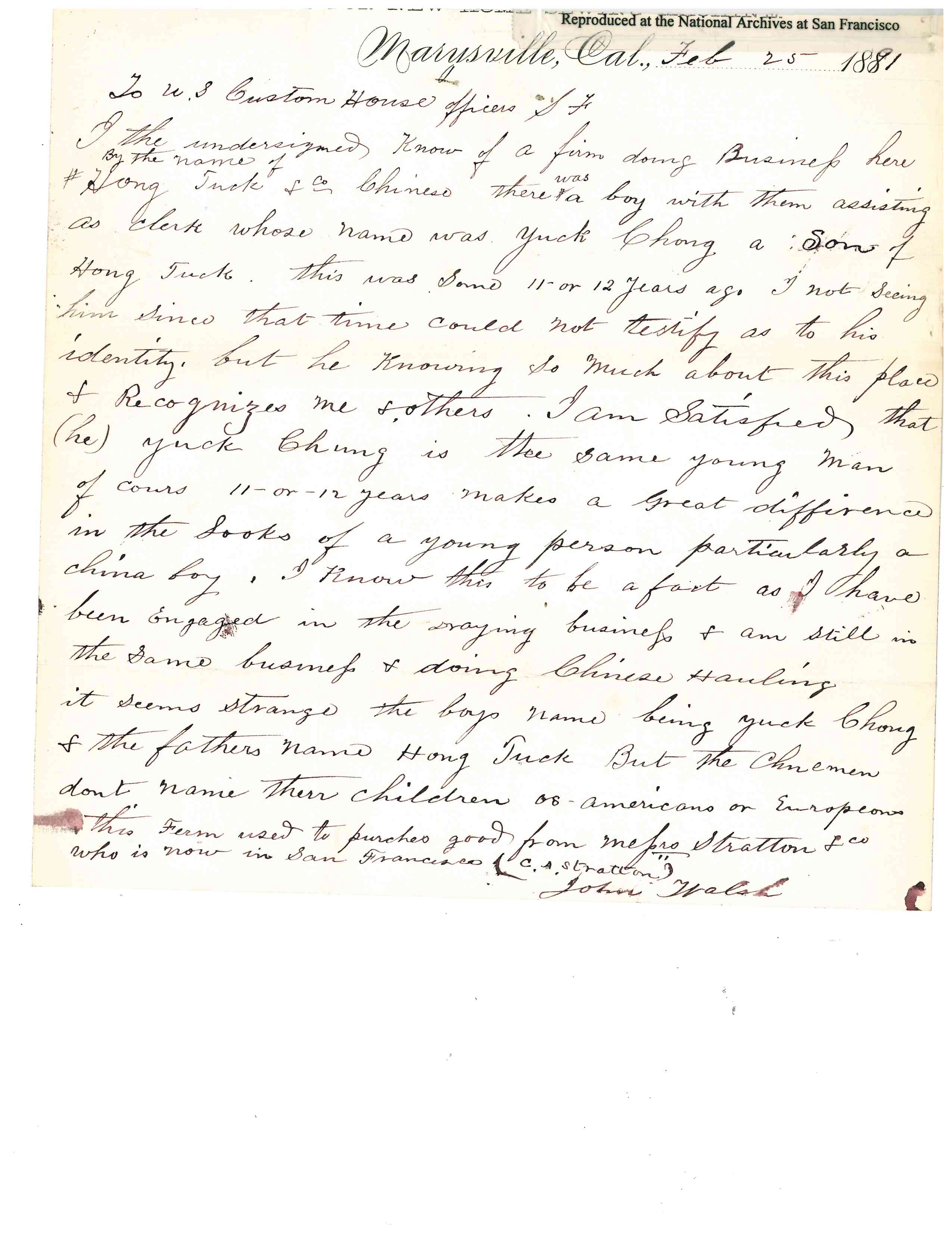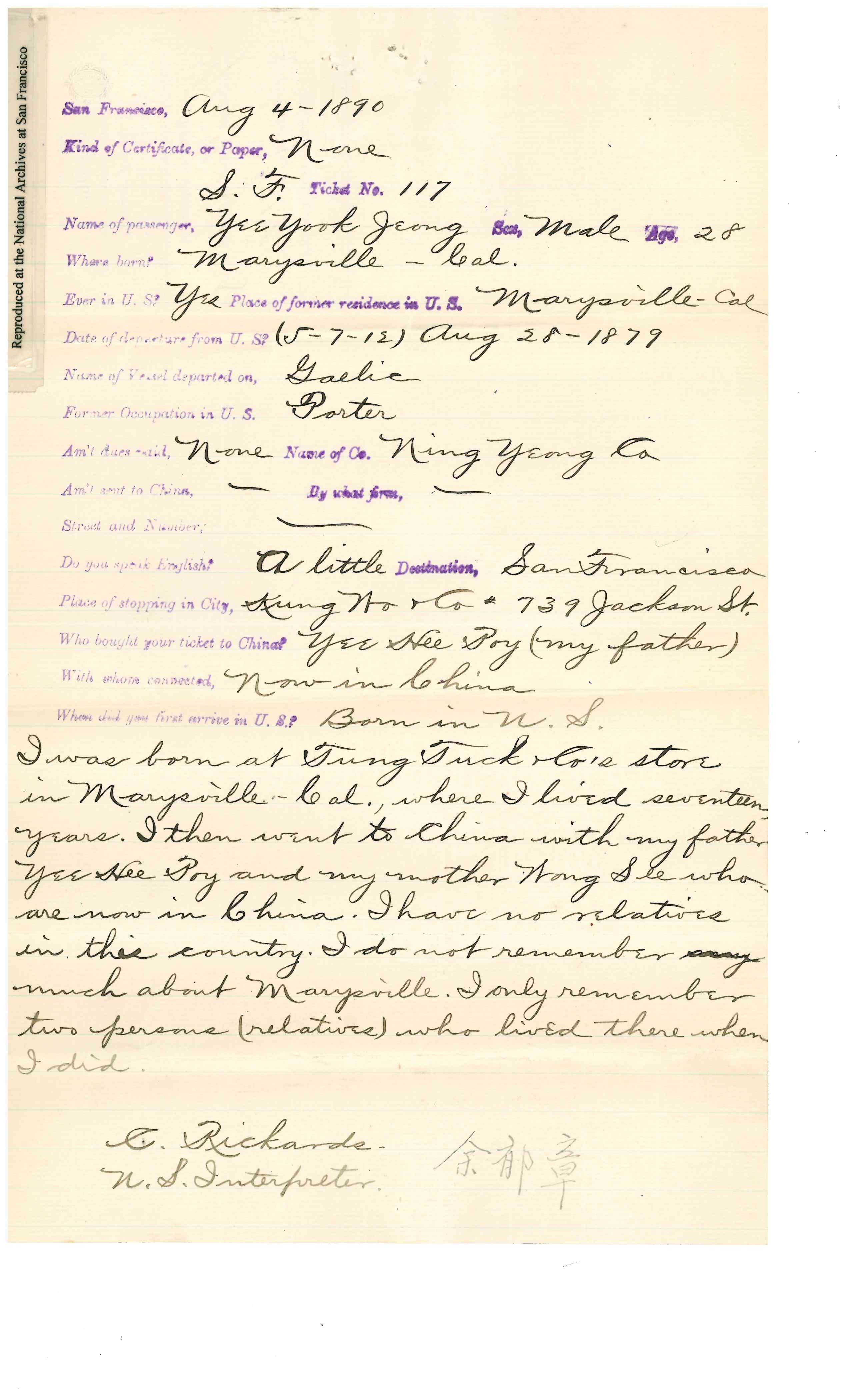Yee Yook Jung was born to Yee Hee Poy (father) and Wong Shee (mother) in1862 at Marysville, California. He left for China on August 28, 1879 on the steamship