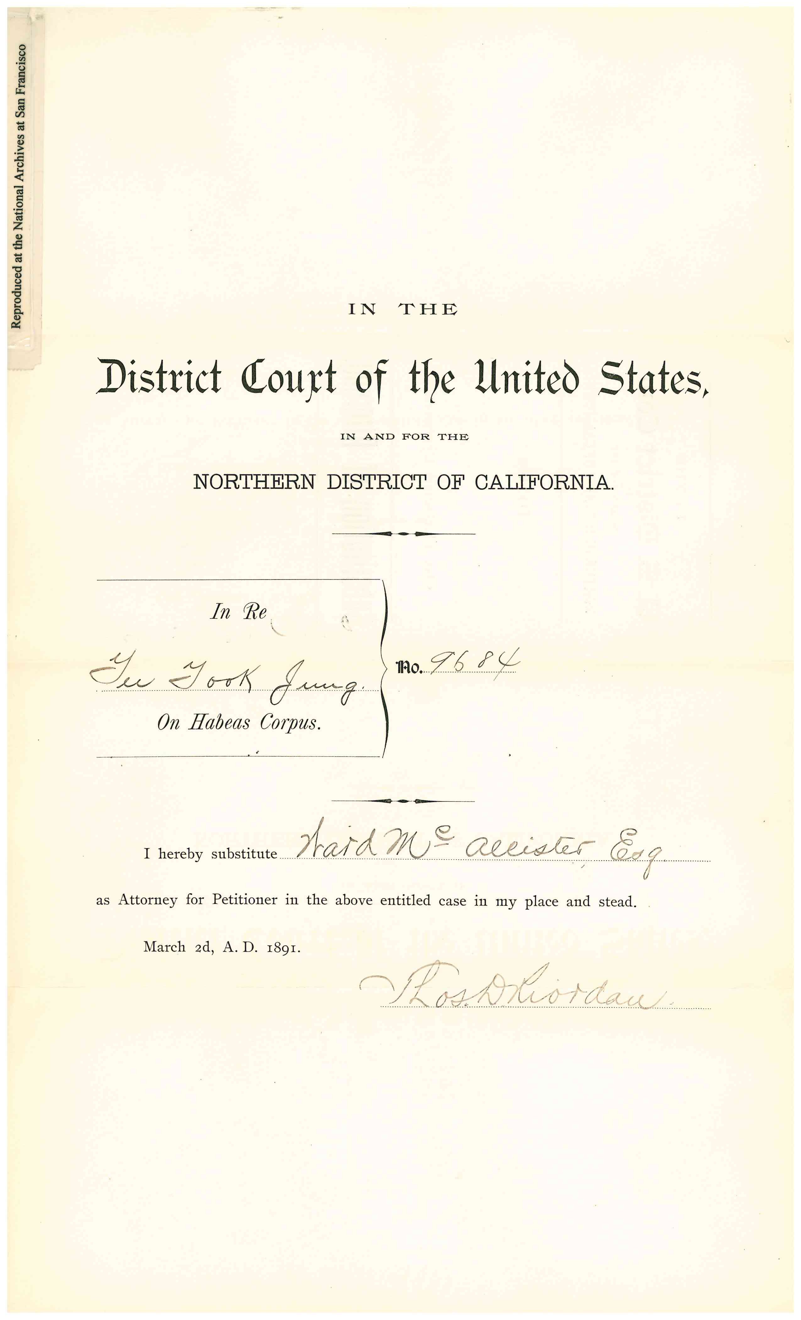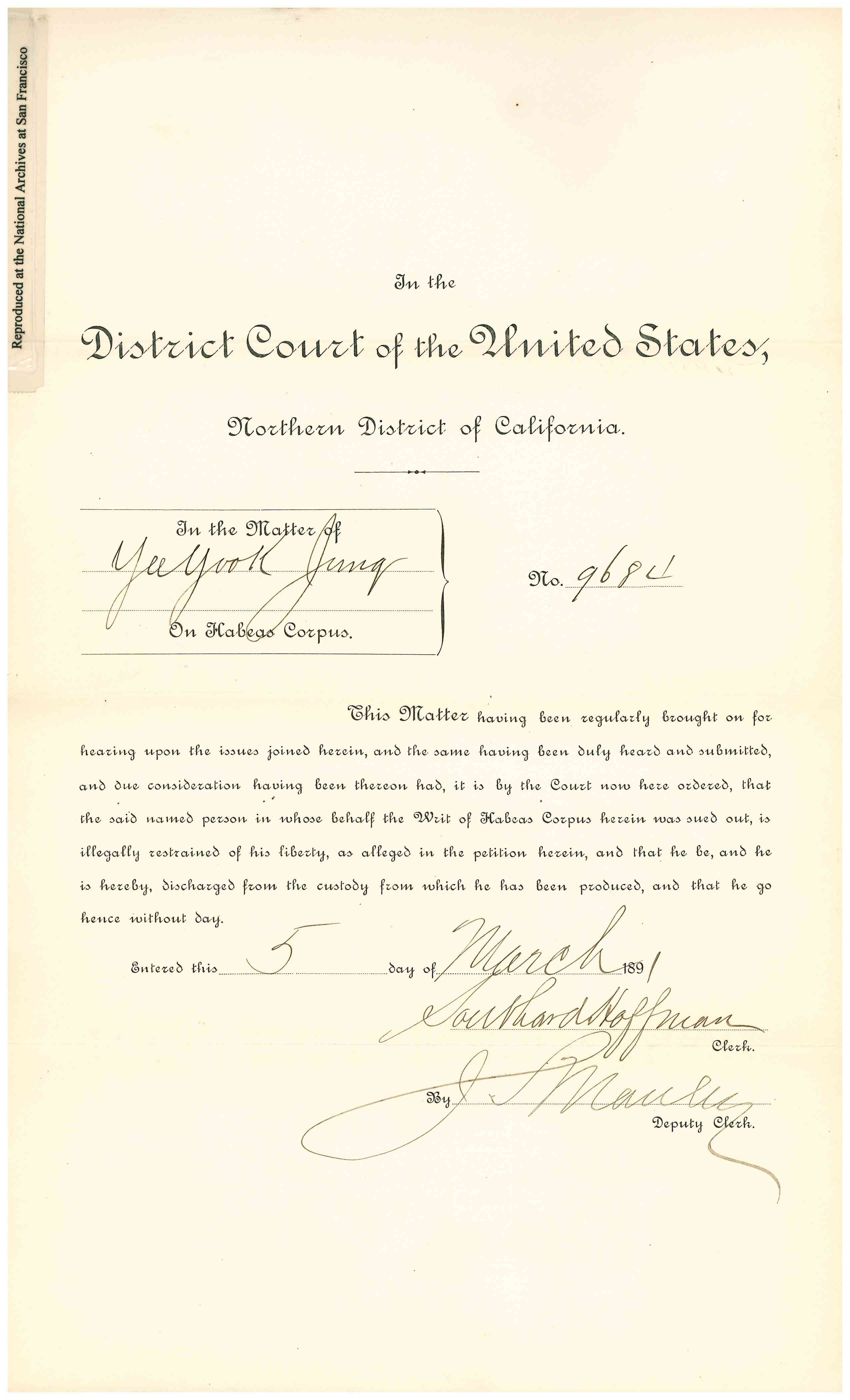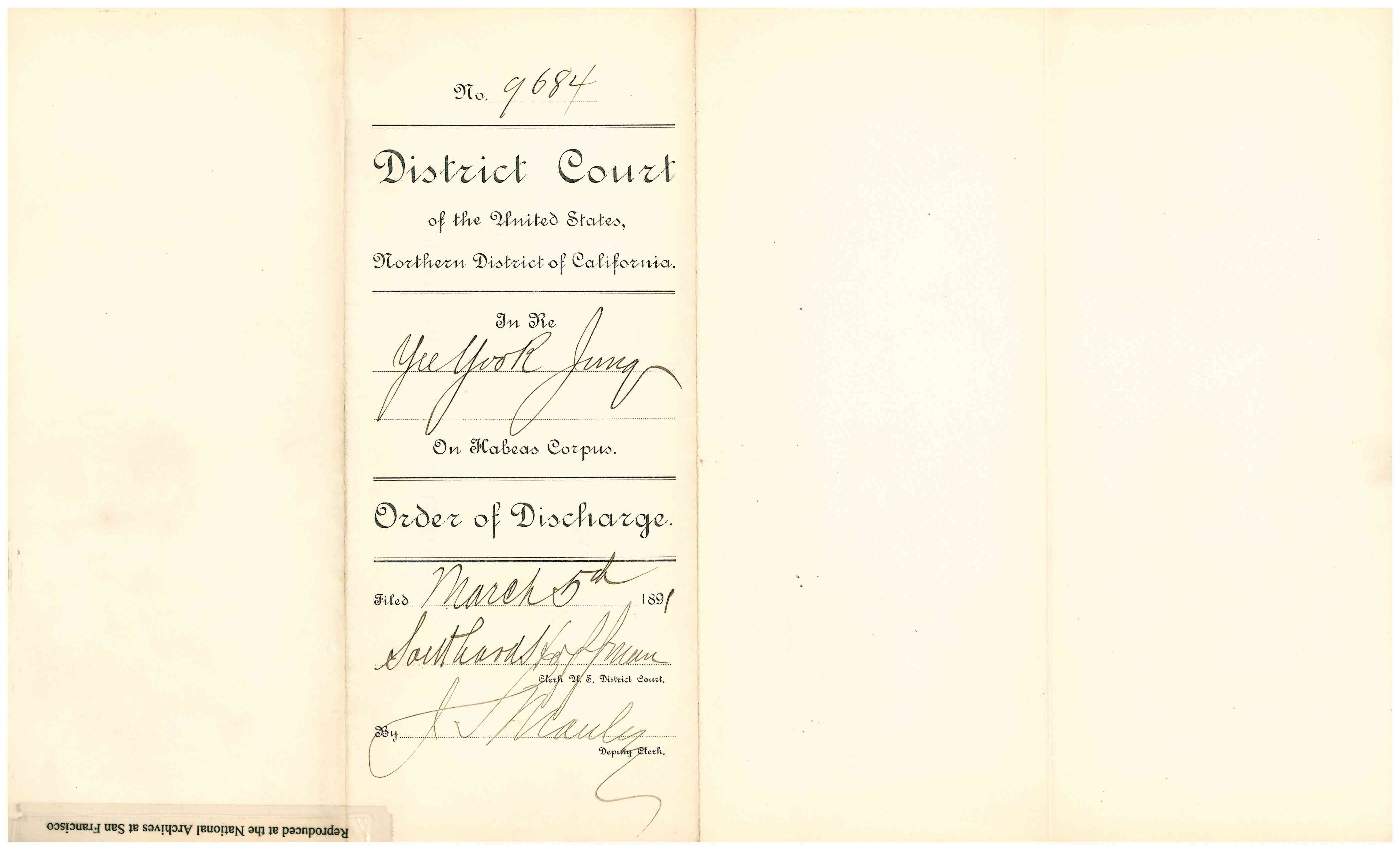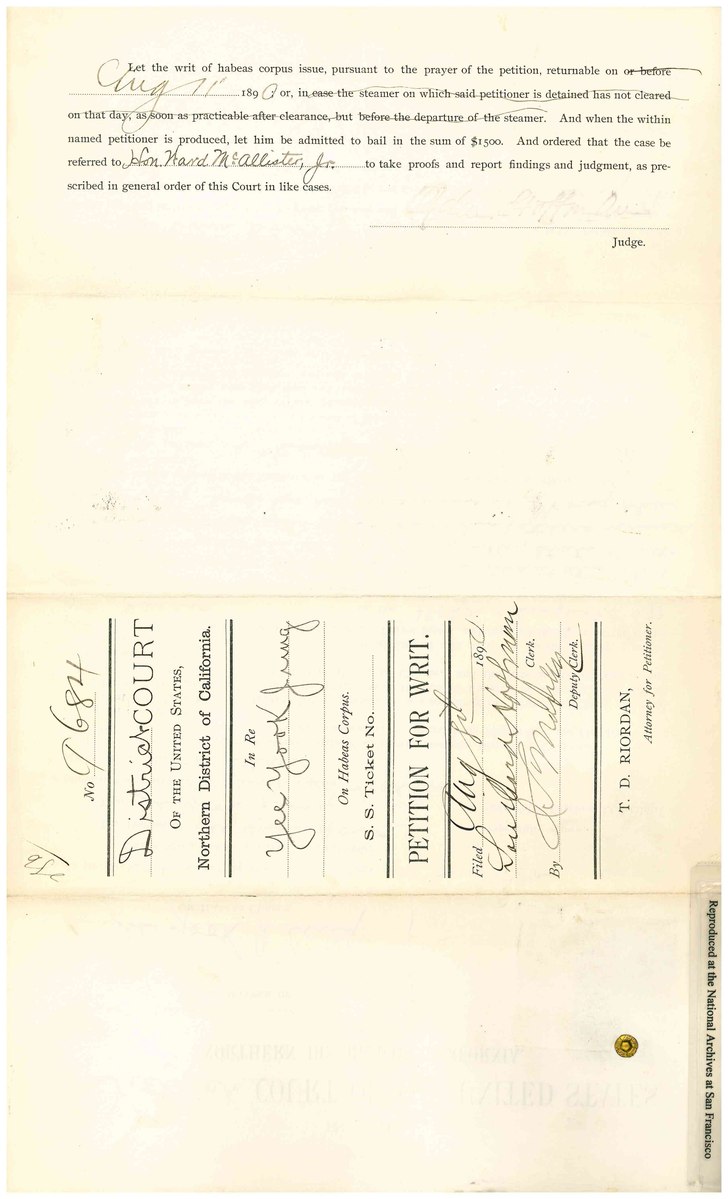 Riordan and Ward McAllister. On March 5, 1891an Order of Discharge was signed to allow the detainee to remain in the country.