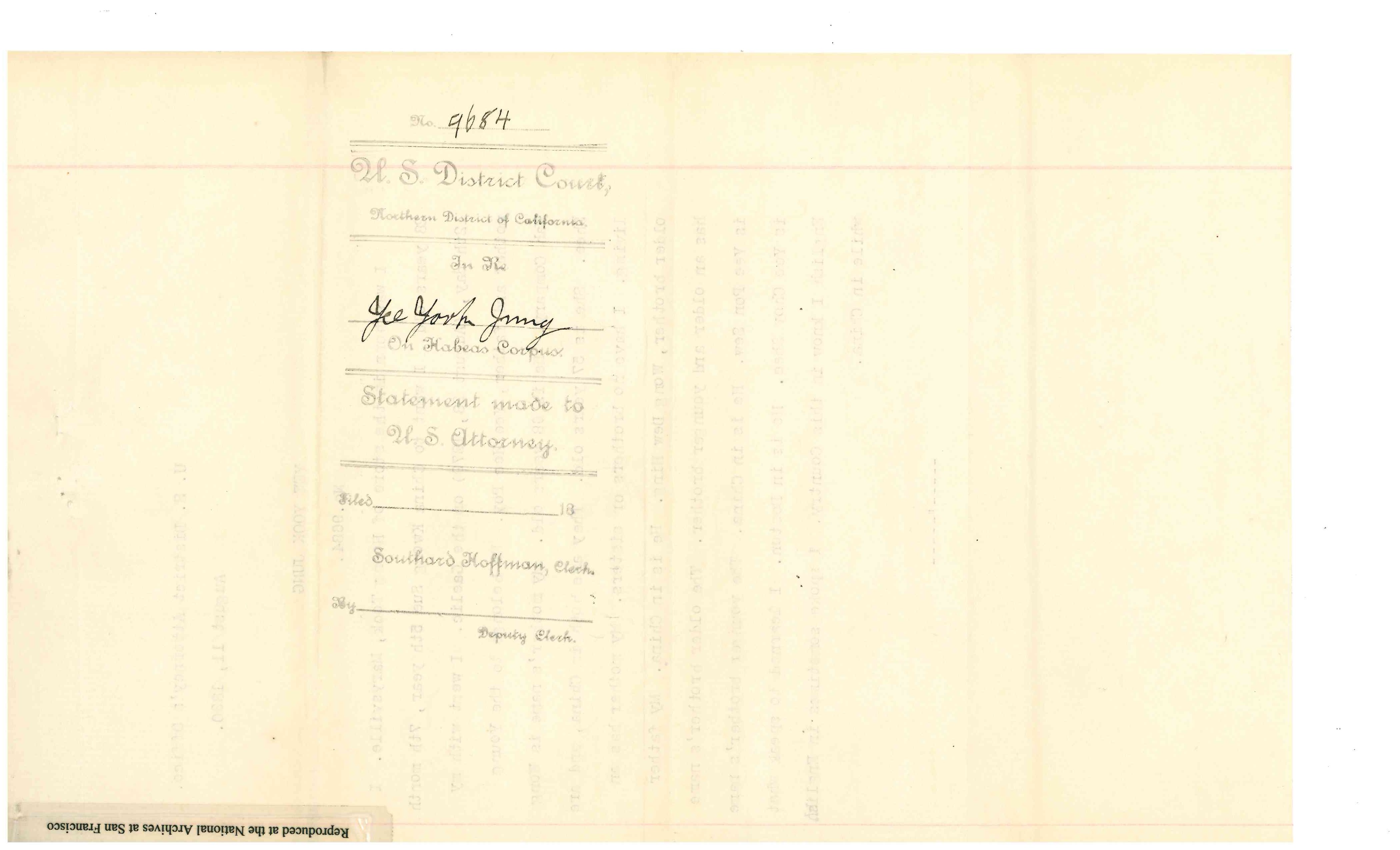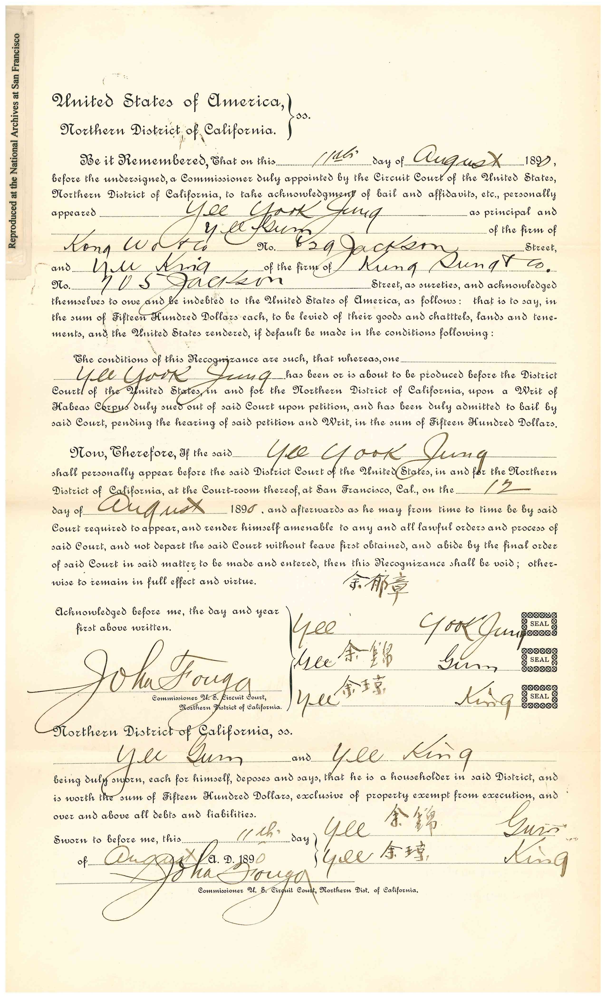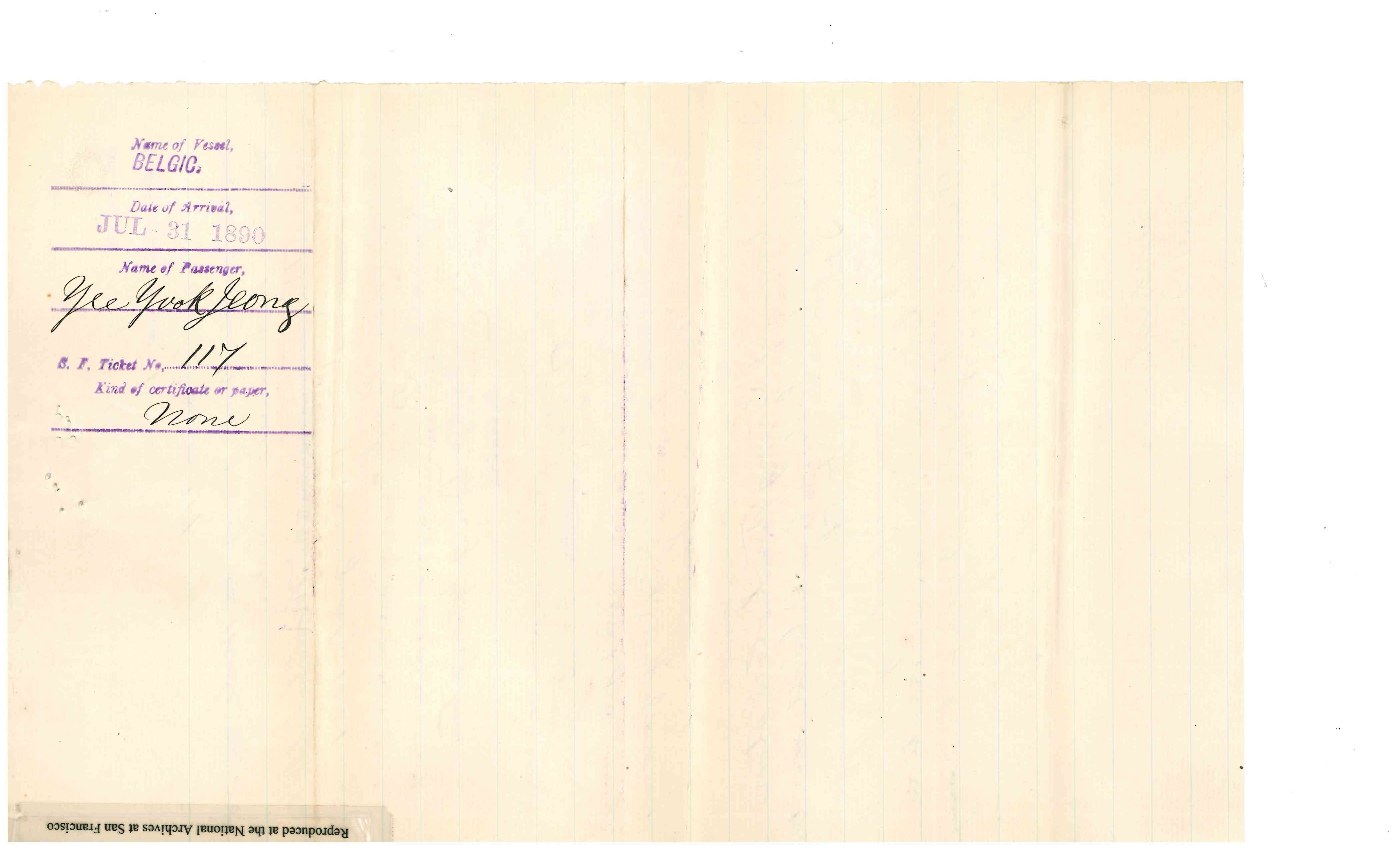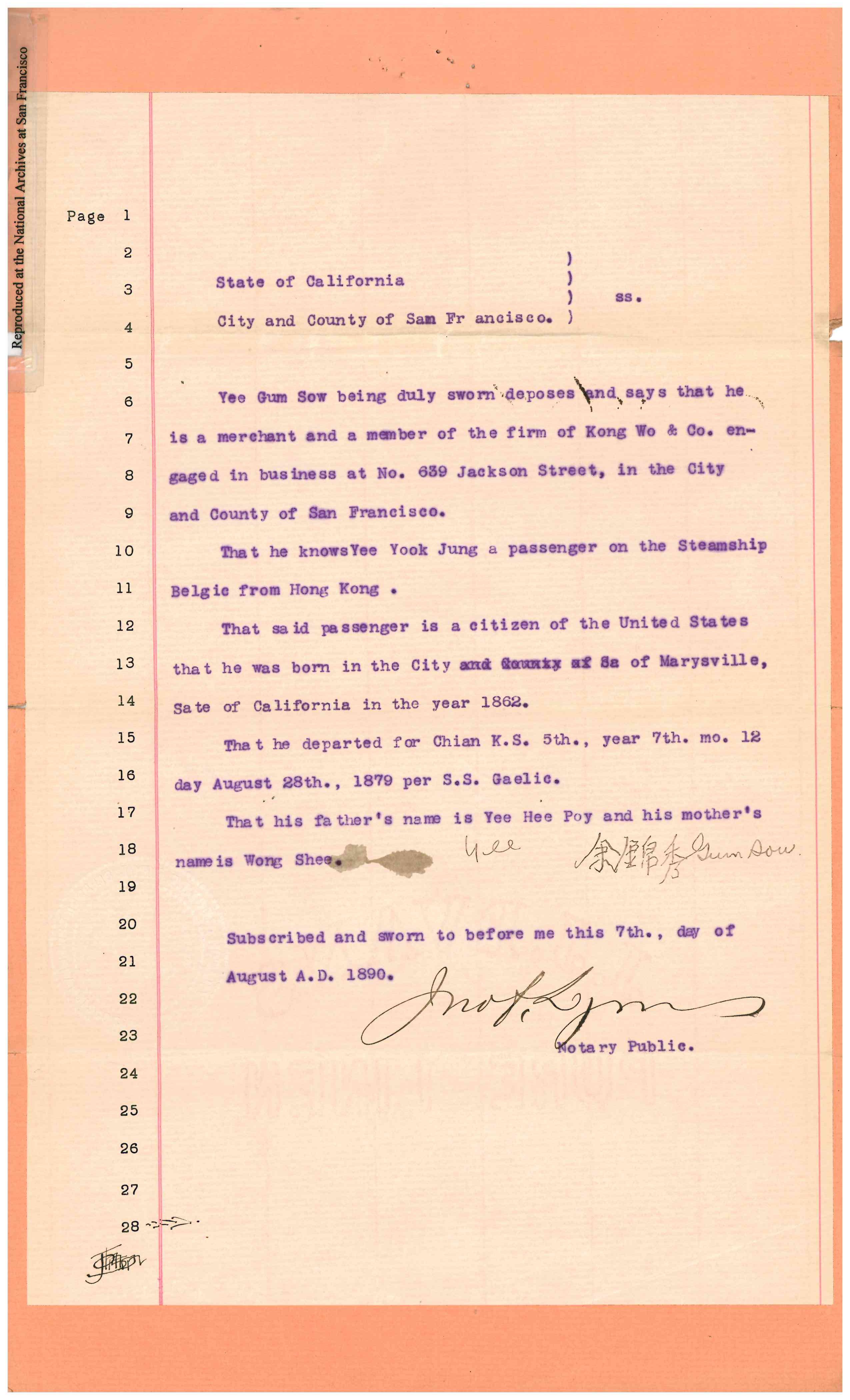 Gaelic. He returned on the steamship Belgic, and arrived in San Francisco on July 31, 1890. The Collector of the Port of San Francisco refused permission for his landing. Yee Gum Sow petitioned for a Writ of Habeas Corpus on August 8, 1890. A bond was posted. S. C. Houghton, Commissoner recommended Discharge on March 5, 1891. Detainee was represented by Thomas