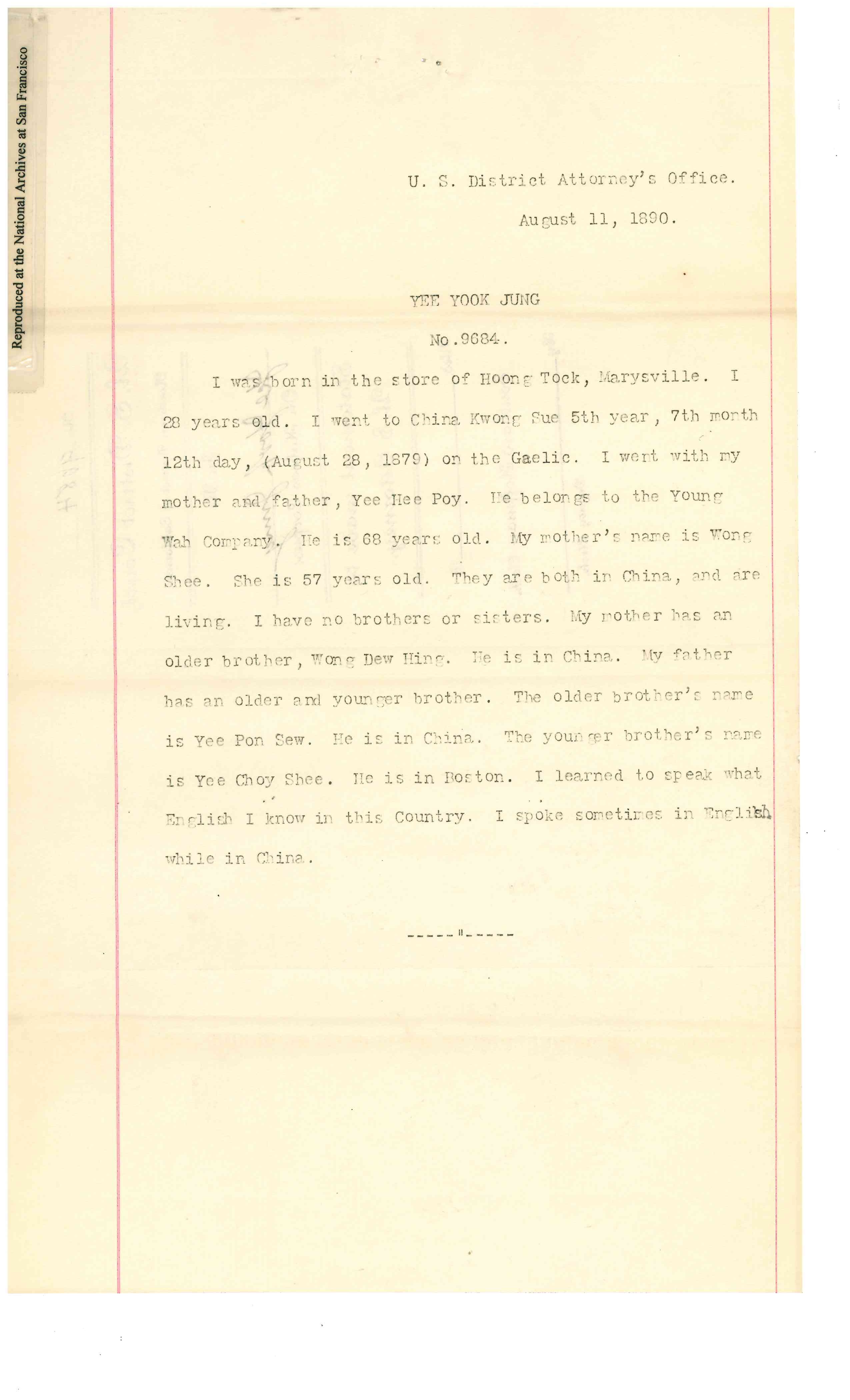 Yee Yook Jung was born to Yee Hee Poy (father) and Wong Shee (mother) in1862 at Marysville, California. He left for China on August 28, 1879 on the steamship