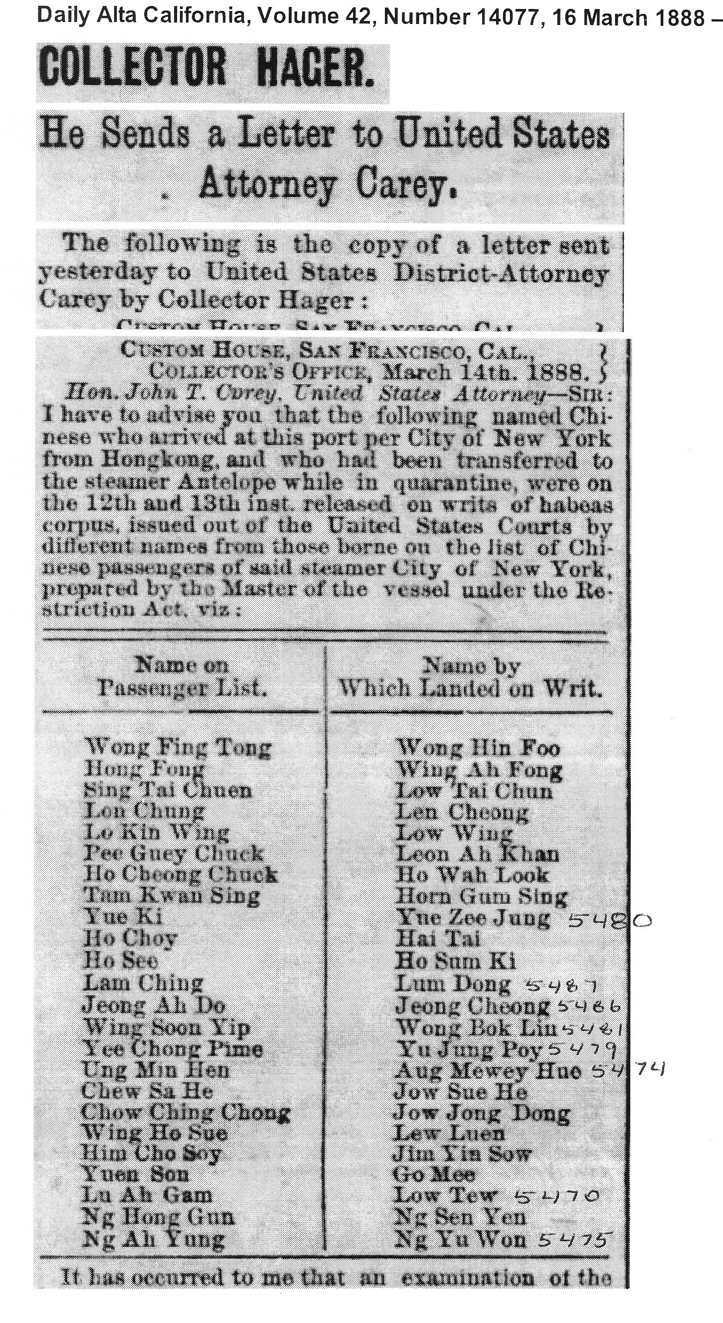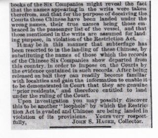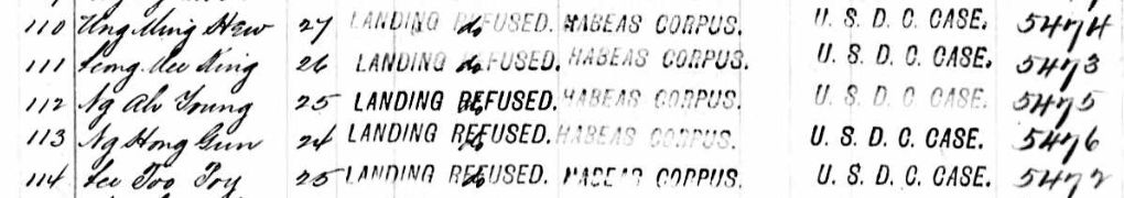 Corresponding immigration index cards from " Register of Federal Court Cases Related to Chinese Americans and Chinese Immigrants Arriving at or Departing From San Francisco, California, ca. 1883-ca. 1916, and Head Tax Cards of Alien Seamen Examined at San Francisco, California, 1921-1924".I have also included examples of Habeas Corpus file numbers and immigration index cards that do NOT match. This register is most useful to researchers who have located a court case file and want to know if an individual had a corresponding INS case file.